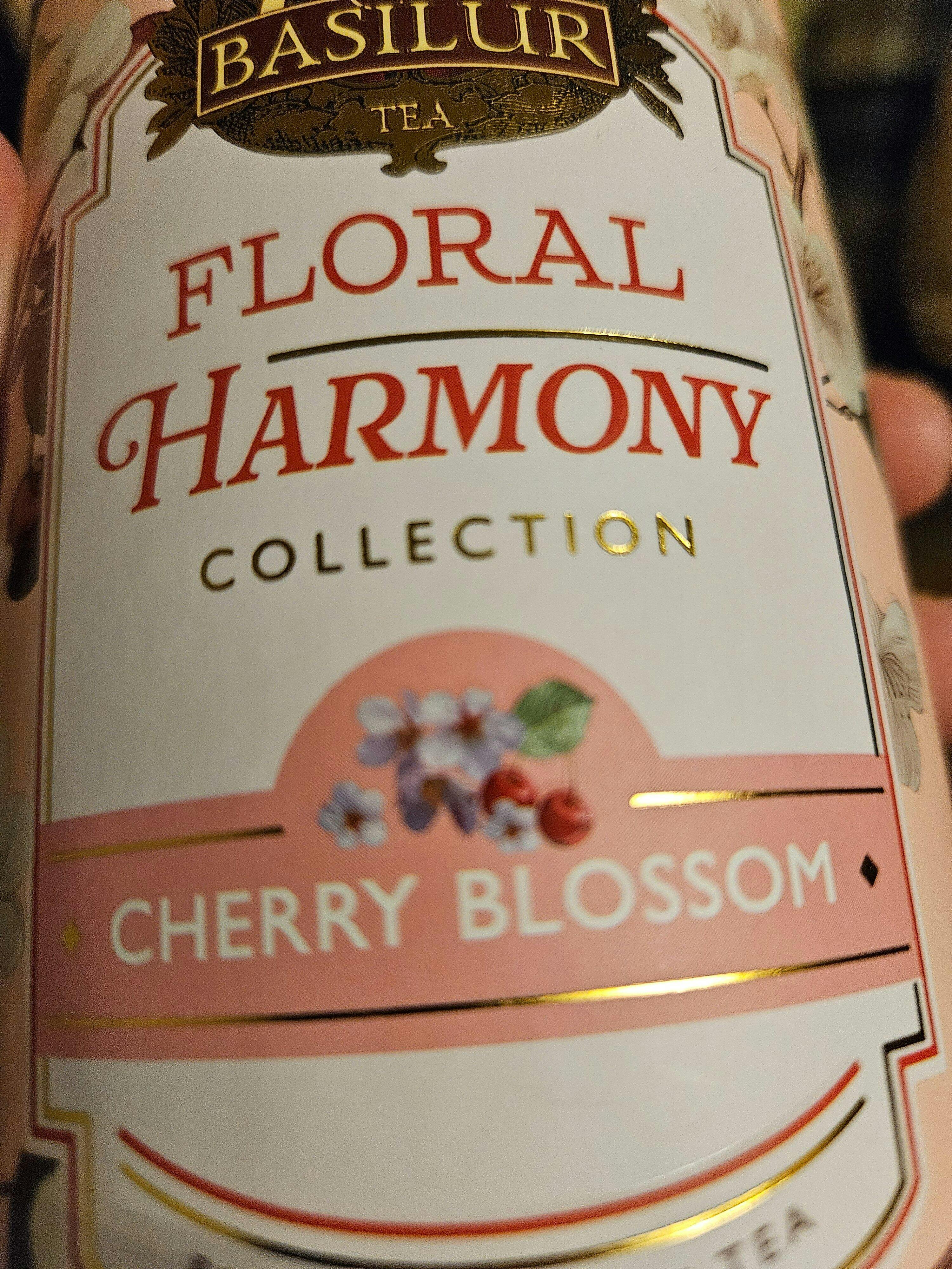 Basilur Cherry Blossom - listki zielonej herbaty cejlońskiej zmieszane z listkami zielonej herbaty z innego regionu z dodatkiem wiśni, płatków róży oraz naturalnym aromatem kwiatu wiśni i wiśni. Różowa tuba z motywem kwiatów i owoców w pastelowych barwach.